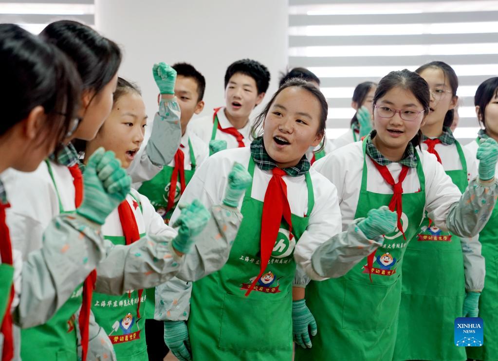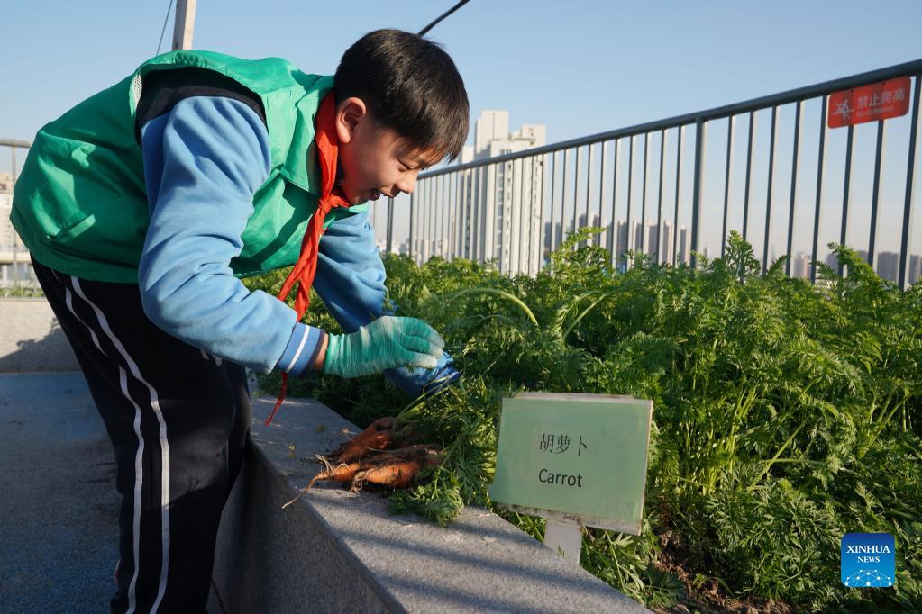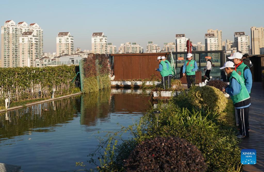 Photo taken on Nov. 24, 2021 shows Jinhua Middle School agronomy group working in their "rooftop eco-garden", as part of an anniversary exhibition of the project. The school, affiliated to East China Normal University in Shanghai, built the "eco-garden" on the rooftop of a 6-storey building a year ago. It has become invaluable for students developing practical agronomy skills during their extra-curricular hours. (Xinhua/Liu Ying)
