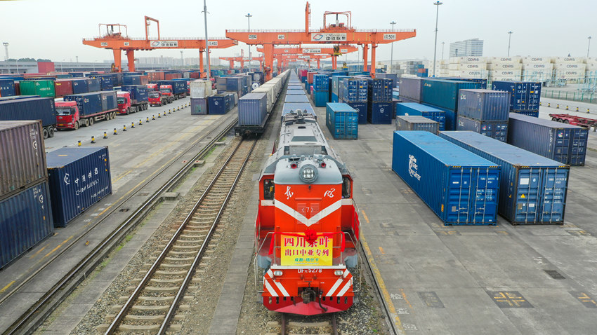 Freight train loaded with 1,300 tonnes of Sichuan tea leaves departs for Central Asia (3)