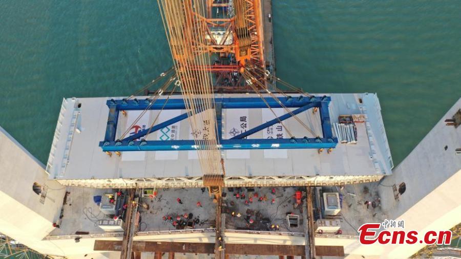 First steel box girder installation of a bridge construction at the Zhongshan section of the Shenzhen-Zhongshan Bridge is underway in Zhongshan City, south China's Guangdong Province, Nov. 24, 2021. (Photo provided by Guangdong Provincial Communications Group)