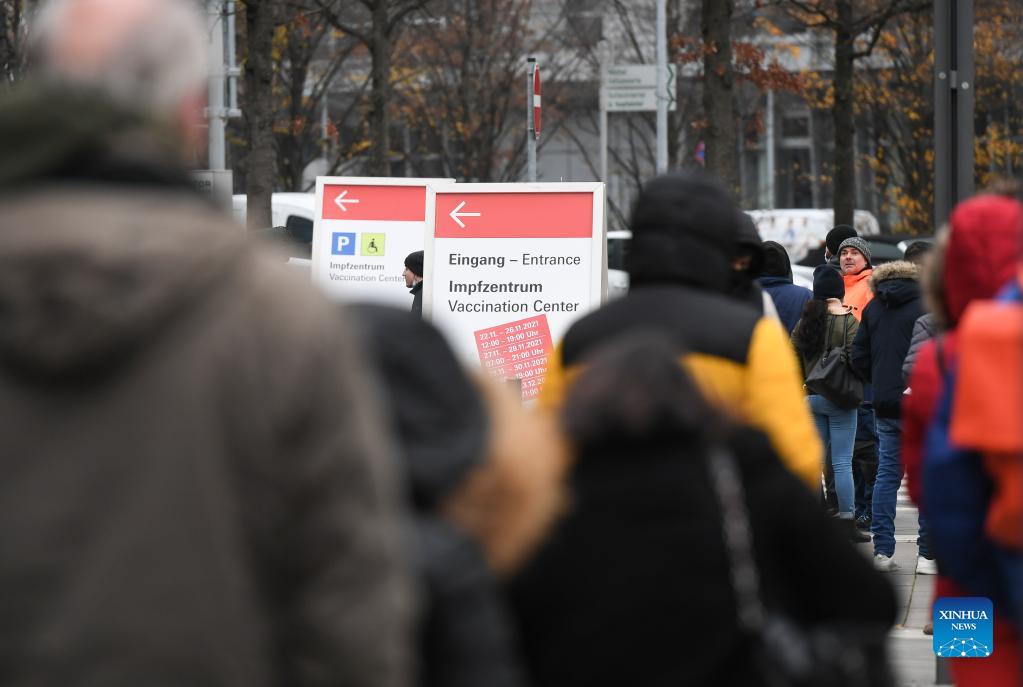 People queue to receive the COVID-19 vaccine outside a vaccination center in Frankfurt, Germany, on Nov. 25, 2021. The total number of COVID-19 deaths in Germany has climbed to 100,119, as 351 fatal cases were recorded within the last 24 hours, the Robert Koch Institute (RKI) announced on Thursday. (Xinhua/Lu Yang)