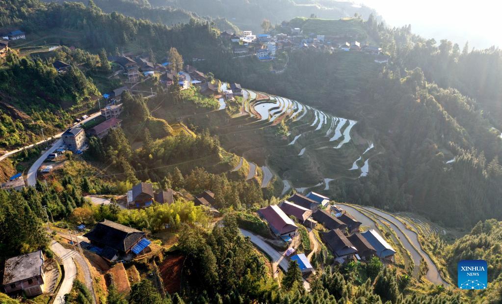 Aerial photo taken on Nov. 25, 2021 shows the winter scenery of Dangjiu Village in Gandong Township of Rongshui Miao Autonomous County, south China's Guangxi Zhuang Autonomous Region. (Xinhua/Huang Xiaobang)