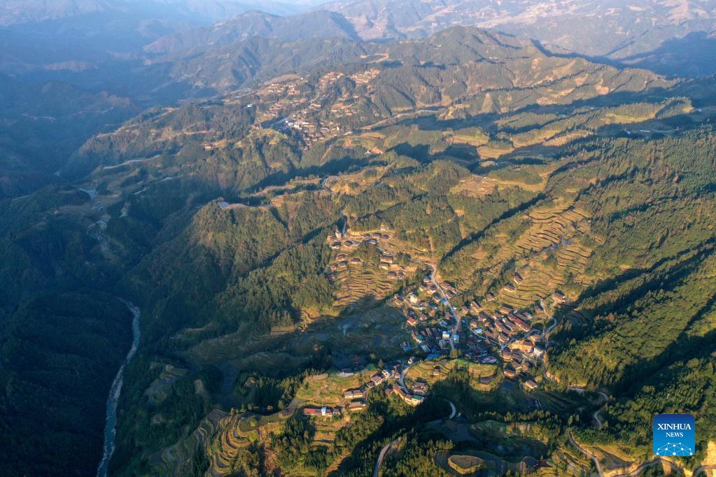 Aerial photo taken on Nov. 25, 2021 shows the winter scenery of Dangjiu Village in Gandong Township of Rongshui Miao Autonomous County, south China's Guangxi Zhuang Autonomous Region. (Xinhua/Huang Xiaobang)