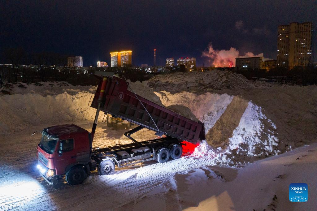 Aerial photo taken on Nov. 24, 2021 shows a vehicle unloading snow at a vacant area in Hegang City, northeast China's Heilongjiang Province. (Xinhua/Xie Jianfei)