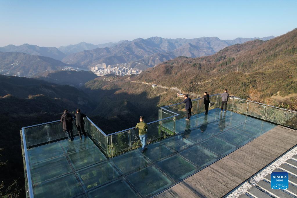 Tourists enjoy the scenery of Qingzhong Village in Chengguan Township, Ziyang County of Ankang City, northwest China's Shaanxi Province, Nov. 24, 2021. Famous for its tea plantation, Ziyang County has been in recent years promoting rural tourism in a bid to help increase the incomes of local residents by combining its tourism with tea culture. (Xinhua/Shao Rui)