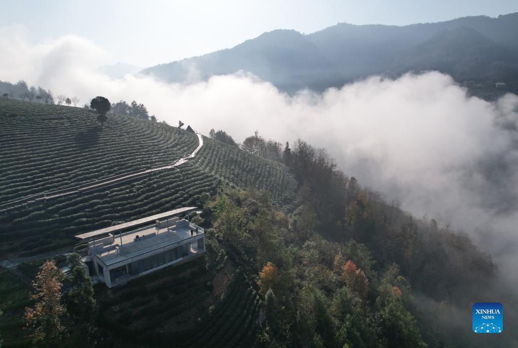 Aerial photo taken on Nov. 24, 2021 shows tea gardens in Yingliang Village, Xiangyang Township, Ziyang County of Ankang City, northwest China's Shaanxi Province. Famous for its tea plantation, Ziyang County has been in recent years promoting rural tourism in a bid to help increase the incomes of local residents by combining its tourism with tea culture. (Xinhua/Shao Rui)
