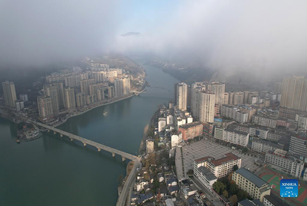 Aerial photo taken on Nov. 25, 2021 shows Ziyang County in Ankang City, northwest China's Shaanxi Province. Famous for its tea plantation, Ziyang County has been in recent years promoting rural tourism in a bid to help increase the incomes of local residents by combining its tourism with tea culture. (Xinhua/Shao Rui)