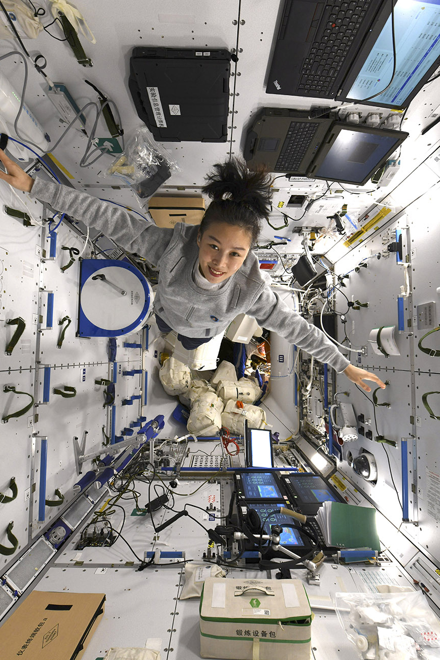 Photo provided by the Astronaut Center of China shows Chinese female taikonaut Wang Yaping in the space station core module Tianhe. (Xinhua)