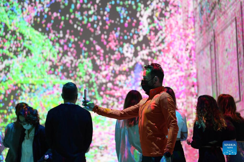 People visit a digital art exhibition at a movie theater in Istanbul, Turkey, on Nov. 24, 2021. A digital art exhibition, created by using artificial intelligence (AI), fascinates art lovers at a newly renovated ancient movie theater in Istanbul. (Xinhua/Sadat)