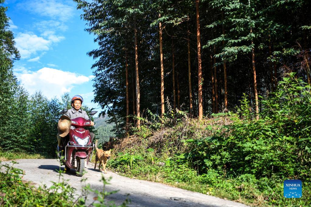 Lei Qiyuan rides heading to the forest area in Tunying Village of Dongxiang Town in Wuxuan County, south China's Guangxi Zhuang Autonomous Region, Nov. 24, 2021. Lei Qiyuan, 66, has been engaged in forest protection for 17 years. Working at an altitude of over 1,400 meters above sea level, Lei is in charge of an area of 5,800 mu (about 386.7 hectares). Lei, trekking several hours every day in patrols, shoulders the responsibility of keeping the forests safe from fire and illegal cutting-down. (Xinhua/Cao Yiming)