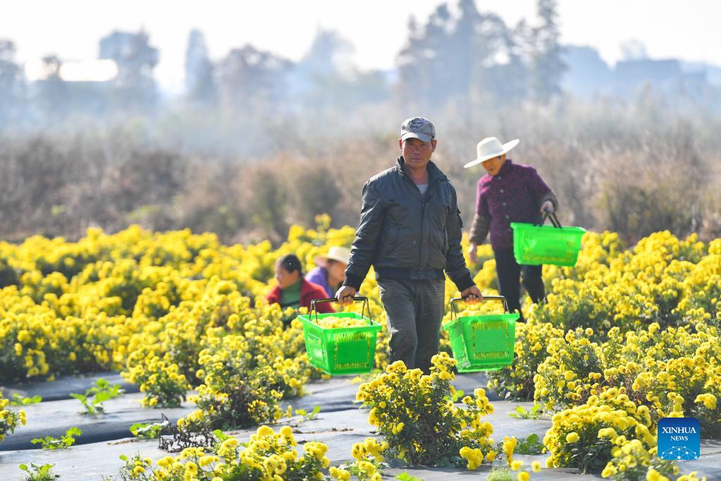 Villagers harvest chrysanthemums in Futang Village of Changsha City, central China's Hunan Province, Nov. 26, 2021. In recent years, Futang Village in Hunan focused on developing chrysanthemum industry through cooperating with enterprises and cooperatives to boost income of villagers and rural revitalization. (Xinhua/Chen Zeguo)