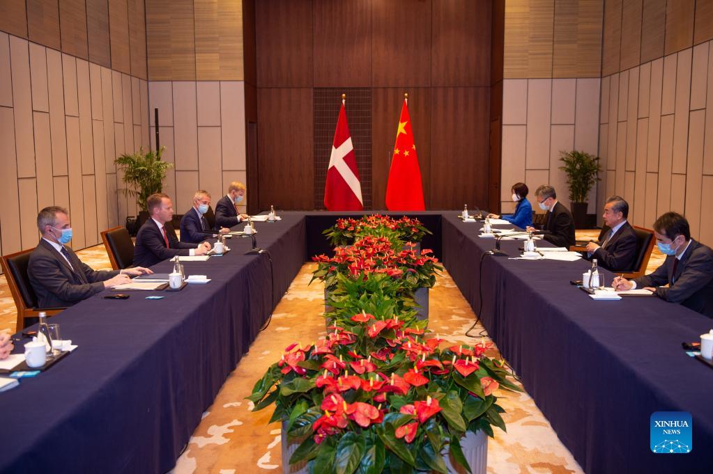 Chinese State Councilor and Foreign Minister Wang Yi holds talks with Danish Foreign Minister Jeppe Kofod in Anji, east China's Zhejiang Province, Nov. 26, 2021. (Xinhua/Jiang Han)