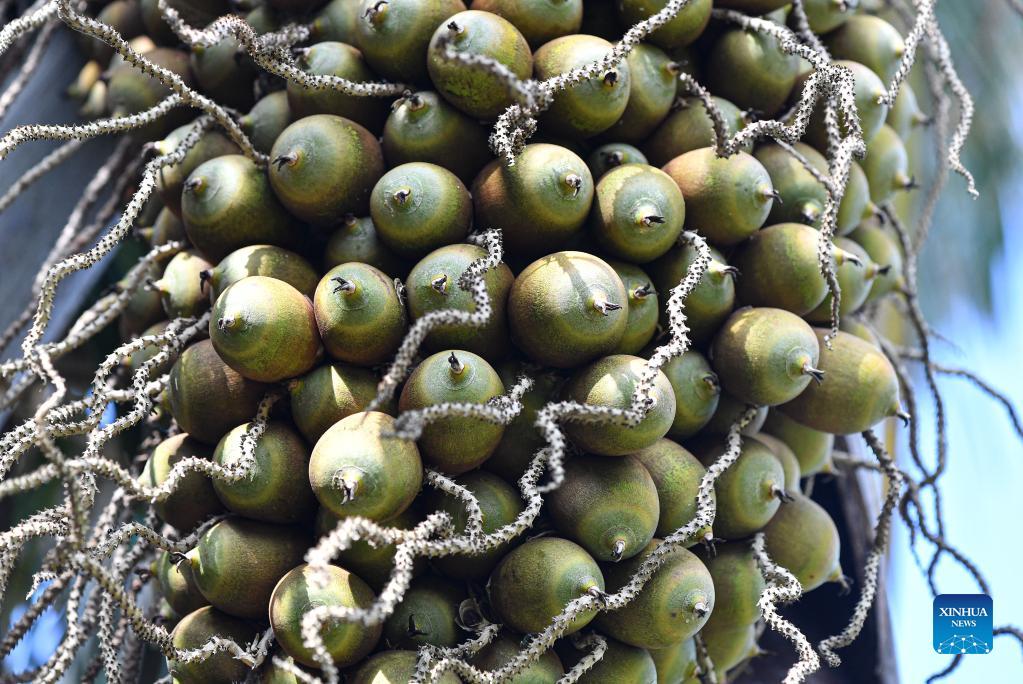 Photo taken on Nov. 16, 2021 shows the Attalea cohune in Hainan Tropical Botanical Garden in Danzhou City, south China's Hainan Province. Hainan Tropical Botanical Garden, located in Danzhou of south China's Hainan, was founded in 1958 and is now affiliated with Chinese Academy of Tropical Agricultural Sciences. The garden, with over 2,600 kinds of tropical and subtropical plants collected from more than 40 countries and regions, is a treasure house of tropical plant resources including flowers, fruit trees, medicinal plants and economic plants, etc. (Xinhua/Pu Xiaoxu)