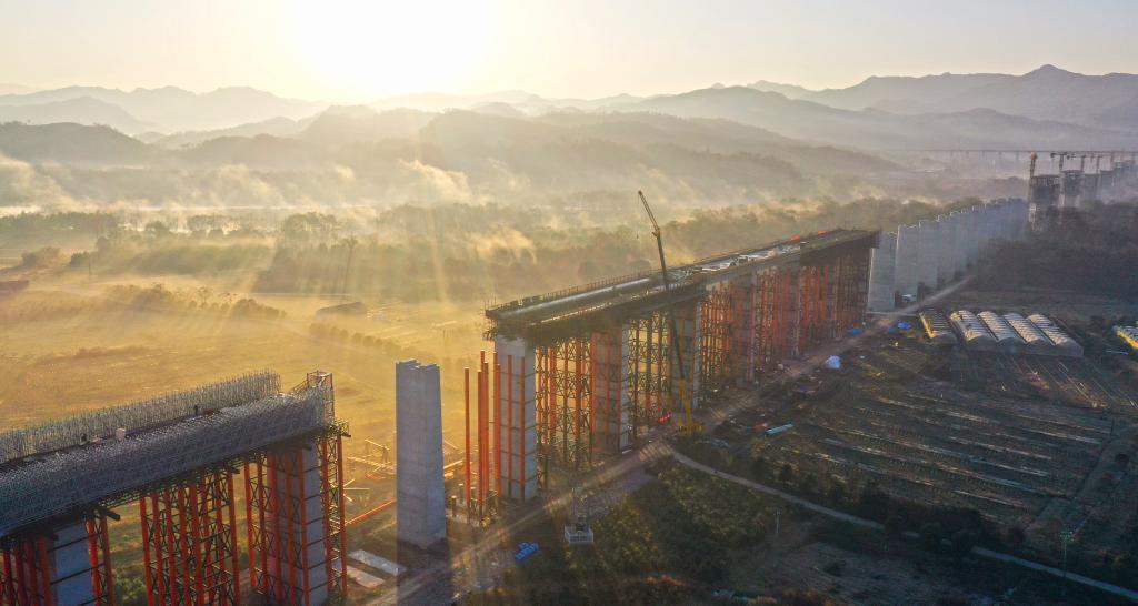 Aerial photo taken on Nov. 26, 2021 shows the construction site of a grand bridge along the Hangzhou-Wenzhou railway amid mist in Guanlu Town of Xianju County, Taizhou City, east China's Zhejiang Province. (Photo by Wang Huabin/Xinhua)