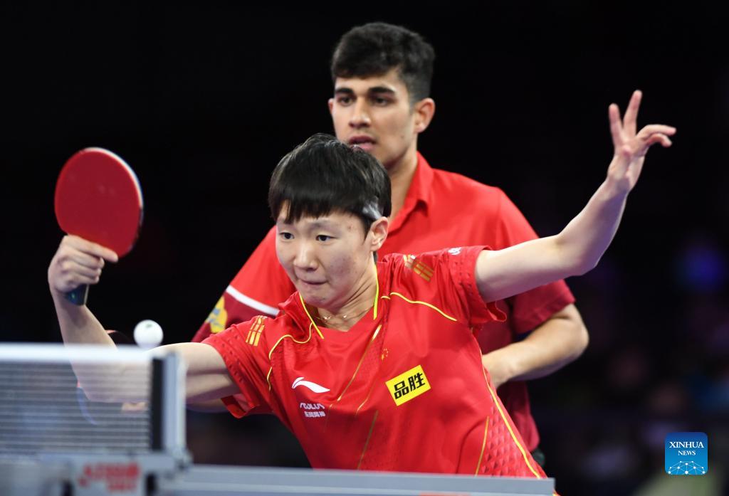Wang Manyu (front)/Kanak Jha compete during the mixed doubles round of 16 match between Wang Manyu of China/Kanak Jha of the United States and Sathiyan Gnanasekaran/Manika Batra of India at 2021 World Table Tennis Championships Finals in Houston, the United States on Nov. 26, 2021. (Xinhua/Wu Xiaoling)