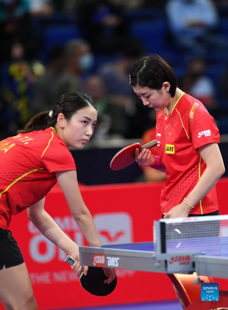 Chen Meng (R)/Qian Tianyi of China compete during the women's doubles round of 16 match between Chen Meng/Qian Tianyi of China and Barbora Balazova of Slovakia/Hana Matelova of the Czech Republic at 2021 World Table Tennis Championships Finals in Houston, the United States on Nov. 26, 2021. (Xinhua/Wu Xiaoling)