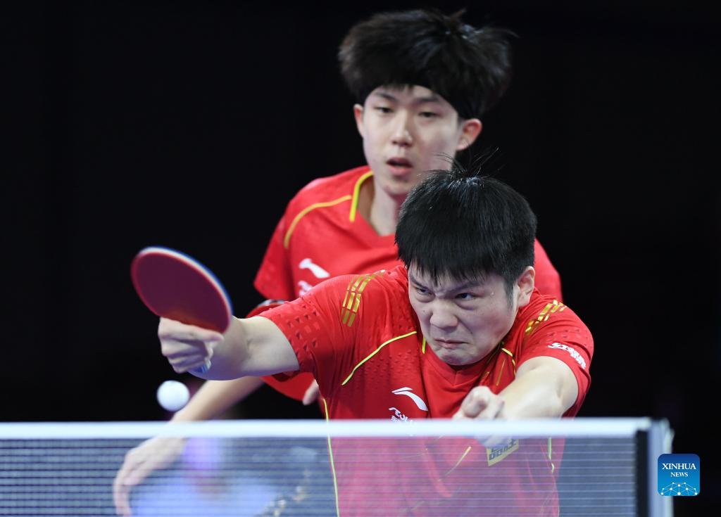 Wang Chuqin (L)/Fan Zhendong compete during the men's doubles round of 16 match between Wang Chuqin/Fan Zhendong of China and Alvaro Robles of Spain/Ovidiu Ionescu of Romania at 2021 World Table Tennis Championships Finals in Houston, the United States on Nov. 26, 2021. (Xinhua/Wu Xiaoling)