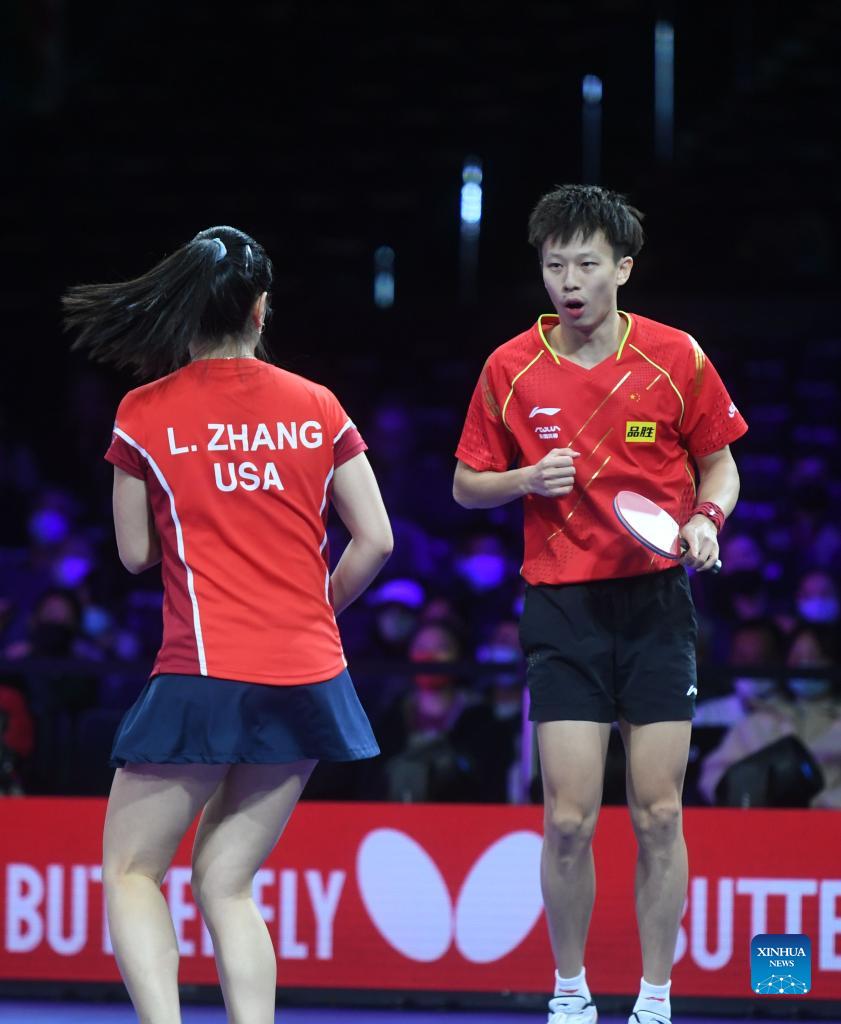 Lin Gaoyuan (R) and Lily Zhang celebrate during the mixed doubles round of 16 match between Lin Gaoyuan of China/Lily Zhang of the United States and Kirill Skachkov/Olga Vorobeva of RTT at 2021 World Table Tennis Championships Finals in Houston, the United States on Nov. 26, 2021. (Xinhua/Wu Xiaoling)
