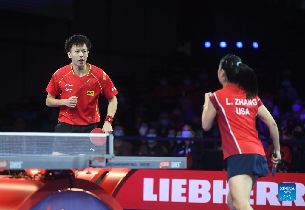 Lin Gaoyuan (L) and Lily Zhang celebrate during the mixed doubles round of 16 match between Lin Gaoyuan of China/Lily Zhang of the United States and Kirill Skachkov/Olga Vorobeva of RTT at 2021 World Table Tennis Championships Finals in Houston, the United States on Nov. 26, 2021. (Xinhua/Wu Xiaoling)