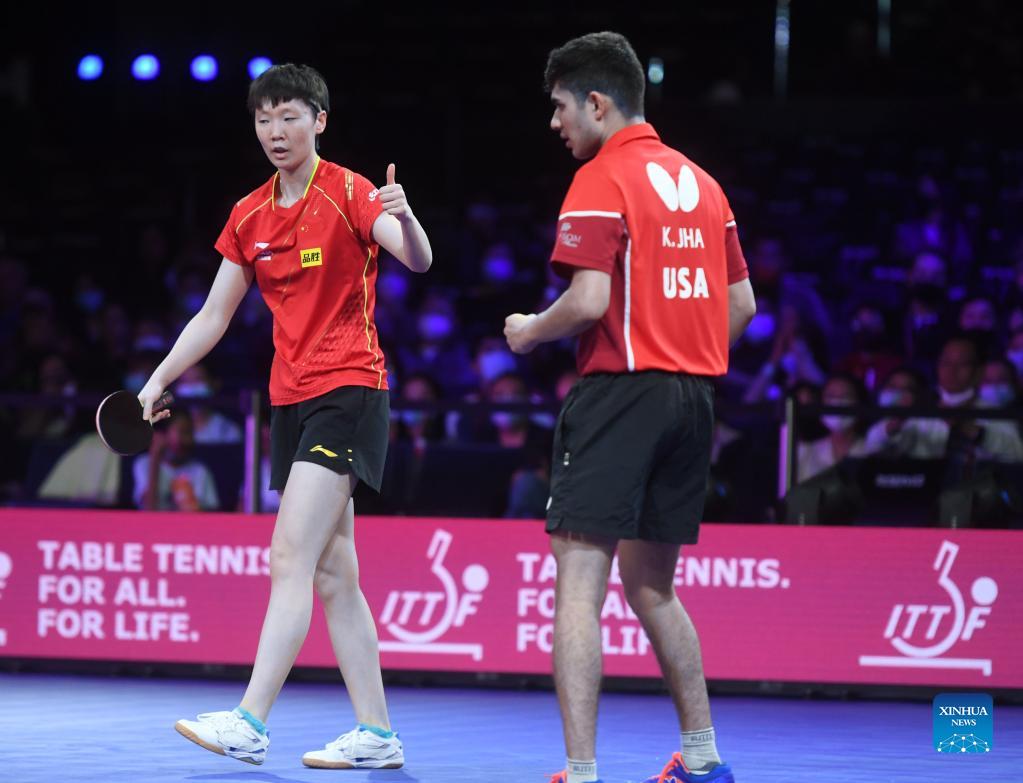 Wang Manyu (L)/Kanak Jha react during the mixed doubles round of 16 match between Wang Manyu of China/Kanak Jha of the United States and Sathiyan Gnanasekaran/Manika Batra of India at 2021 World Table Tennis Championships Finals in Houston, the United States on Nov. 26, 2021. (Xinhua/Wu Xiaoling)