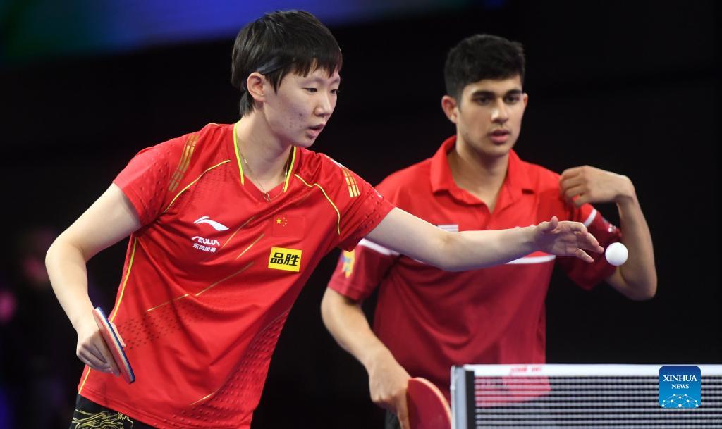 Wang Manyu (L)/Kanak Jha compete during the mixed doubles round of 16 match between Wang Manyu of China/Kanak Jha of the United States and Sathiyan Gnanasekaran/Manika Batra of India at 2021 World Table Tennis Championships Finals in Houston, the United States on Nov. 26, 2021. (Xinhua/Wu Xiaoling)