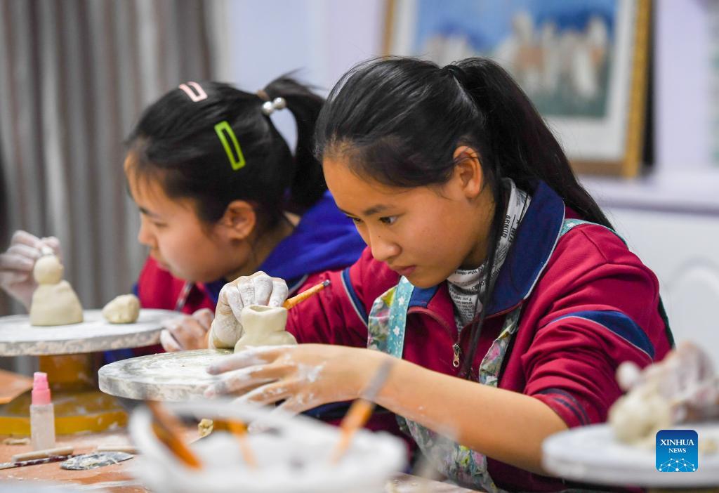 Students make clay sculptures during their extra-curricular hours at a middle school in Xilinhot City in north China's Inner Mongolia Autonomous Region, on Nov. 26, 2021. Extra-curricular activities aim to meet the needs of different students and promote their healthy development. (Xinhua/Peng Yuan)