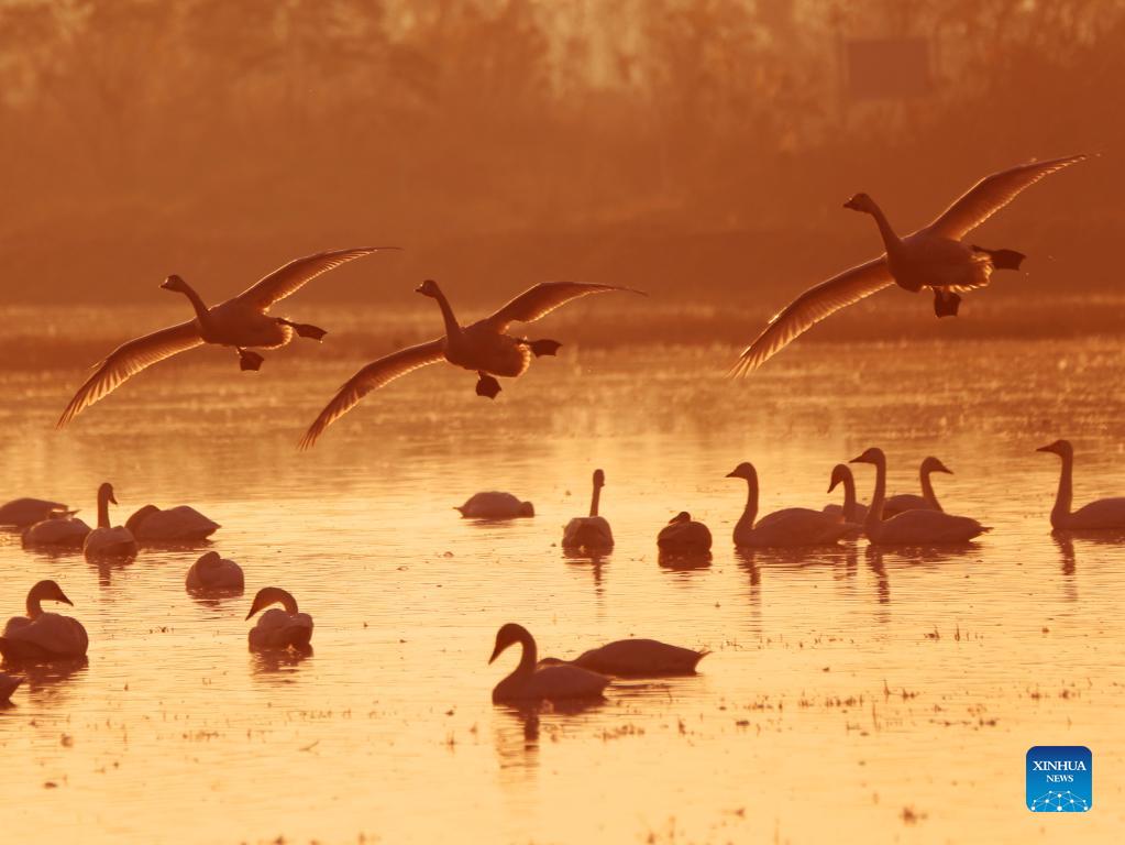 Little swans are seen at the Donggu Lake wetland of the Quyuan administration area in Yueyang City, central China's Hunan Province, Nov. 27, 2021. About 3,000 little swans have arrived at the Donggu Lake wetland of the Quyuan administration area in Yueyang for wintering. (Photo by Cao Zhengping/Xinhua)
