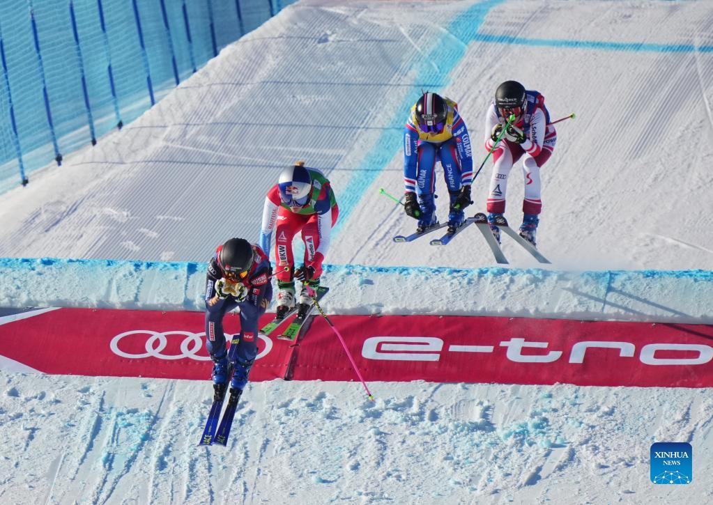 Sweden's Sandra Naeslund (1st L), Switzerland's Fanny Smith (2nd L), France's Marielle Berger Sabbatel (2nd R) compete during the women's ski cross final at the FIS Ski World Cup in Chongli, north China's Hebei Province, Nov. 27, 2021. (Xinhua/Yang Shiyao)