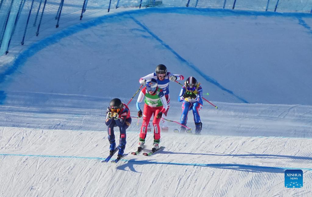 Sweden's Sandra Naeslund (1st L), Switzerland's Fanny Smith (2nd L), France's Marielle Berger Sabbatel (1st R) compete during the women's ski cross final at the FIS Ski World Cup in Chongli, north China's Hebei Province, Nov. 27, 2021. (Xinhua/Yang Shiyao)