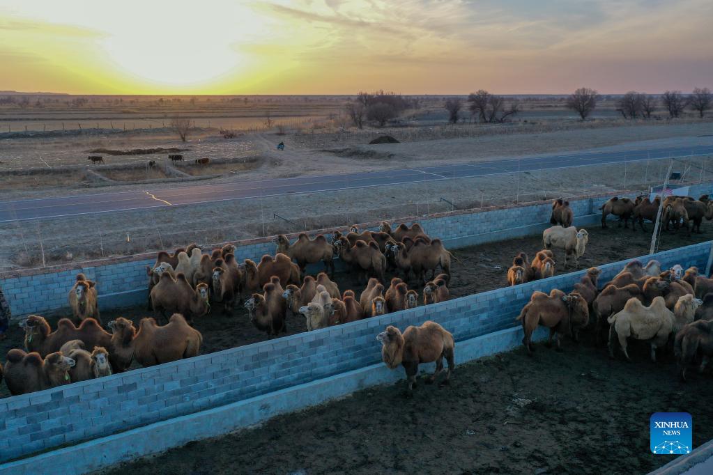 Aerial photo taken on Nov. 24, 2021 shows camels raised by a breeder in Fuhai County of Altay, northwest China's Xinjiang Uygur Autonomous Region. Fuhai, located in north Xinjiang, is an important stock farming base in the region, with unique geographical and climatic conditions especially suitable for camel breeding. In recent years, camel breeding has developed into a pillar industry under promotion policy in Fuhai. By establishing camel milk cooperatives, individual herders here are accessing the dairy market through unified and stable sales channels. In 2021, the number of camels in the county has totaled 22,300, among which 6,470 are dairy camels with a daily milk output of 12,500 kilograms. (Xinhua/Ding Lei)