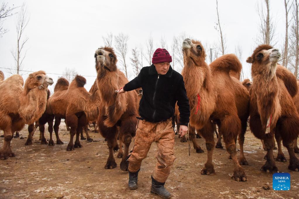 A breeder leads a camel for milking in Fuhai County of Altay, northwest China's Xinjiang Uygur Autonomous Region, Nov. 26, 2021. Fuhai, located in north Xinjiang, is an important stock farming base in the region, with unique geographical and climatic conditions especially suitable for camel breeding. In recent years, camel breeding has developed into a pillar industry under promotion policy in Fuhai. By establishing camel milk cooperatives, individual herders here are accessing the dairy market through unified and stable sales channels. In 2021, the number of camels in the county has totaled 22,300, among which 6,470 are dairy camels with a daily milk output of 12,500 kilograms. (Xinhua/Ding Lei)