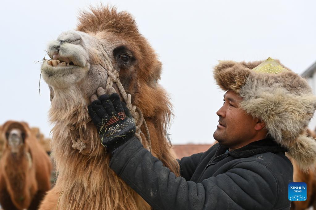 A breeder checks a camel in Fuhai County of Altay, northwest China's Xinjiang Uygur Autonomous Region, Nov. 26, 2021. Fuhai, located in north Xinjiang, is an important stock farming base in the region, with unique geographical and climatic conditions especially suitable for camel breeding. In recent years, camel breeding has developed into a pillar industry under promotion policy in Fuhai. By establishing camel milk cooperatives, individual herders here are accessing the dairy market through unified and stable sales channels. In 2021, the number of camels in the county has totaled 22,300, among which 6,470 are dairy camels with a daily milk output of 12,500 kilograms. (Xinhua/Ding Lei)