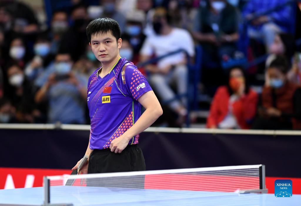 Fan Zhendong competes during the men's singles round of 16 match between Fan Zhendong of China and Wang Chuqin of China at 2021 World Table Tennis Championships Finals in Houston, the United States on Nov. 26, 2021. (Xinhua/Wu Xiaoling)