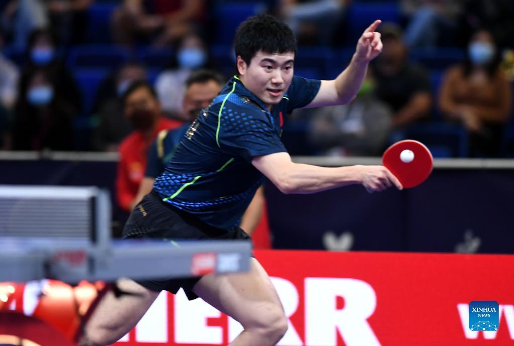 Liang Jingkun competes during the men's singles round of 16 match between Liang Jingkun of China and Liam Pitchford of England at 2021 World Table Tennis Championships Finals in Houston, the United States on Nov. 26, 2021. (Xinhua/Wu Xiaoling)