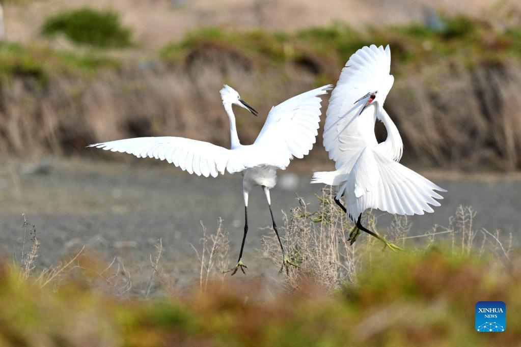Little egrets fight for food at a beach in Jahra Governorate, Kuwait, Nov. 26, 2021. (Photo by Ghazy Qaffaf/Xinhua)