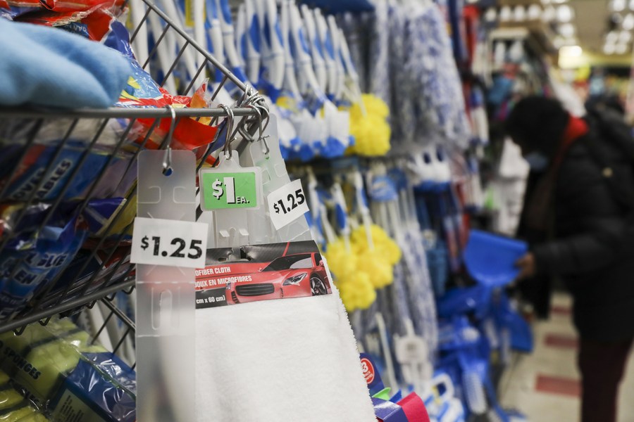 Price tags of 1 U.S. dollar and 1.25 dollars are seen at a Dollar Tree store in New York, the United States, Nov. 26, 2021. U.S. discount retailer Dollar Tree said on Tuesday that the company would raise prices from 1 U.S. dollar to 1.25 dollars on the majority of its products by the first quarter of 2022 amid broad inflation pressures. (Xinhua/Wang Ying)