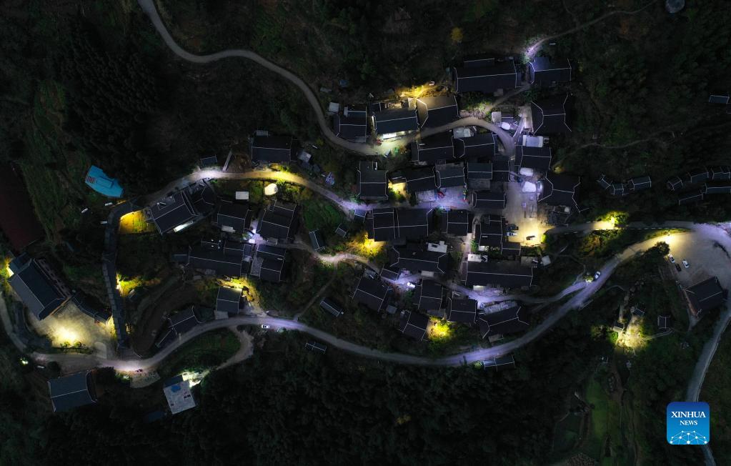 Aerial photo taken on Nov. 27, 2021 shows the night view of Rongdi Village in Sirong Township of Rongshui Miao Autonomous County, south China's Guangxi Zhuang Autonomous Region. More and more solar powered street lamps have been erected in areas tucked away in the mountains in Guangxi, illuminating the night sky for people living there. (Xinhua/Huang Xiaobang)