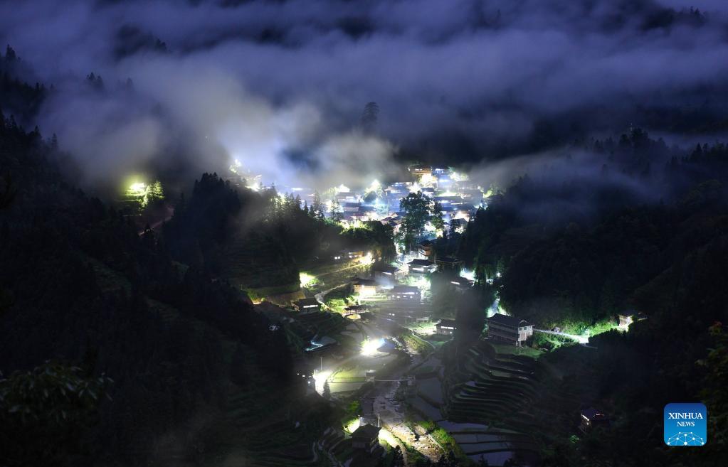 Photo taken on May 20, 2021 shows the night view of Dangjiu Village in Gandong Township of Rongshui Miao Autonomous County, south China's Guangxi Zhuang Autonomous Region. More and more solar powered street lamps have been erected in areas tucked away in the mountains in Guangxi, illuminating the night sky for people living there. (Xinhua/Huang Xiaobang)
