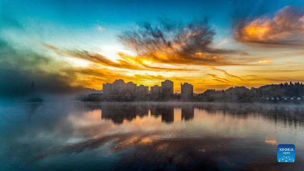 Photo taken on Nov. 25, 2021 shows the sunrise scenery of Lixiang Lake National Wetland Park in Nanchuan District, southwest China's Chongqing Municipality. Local authorities of Nanchuan District have in recent years made all-out efforts to strengthen ecological protection of Lixiang Lake. The endeavor has yielded blue skies and clear waters as well as booming tourism. (Photo by Qu Mingbin/Xinhua)