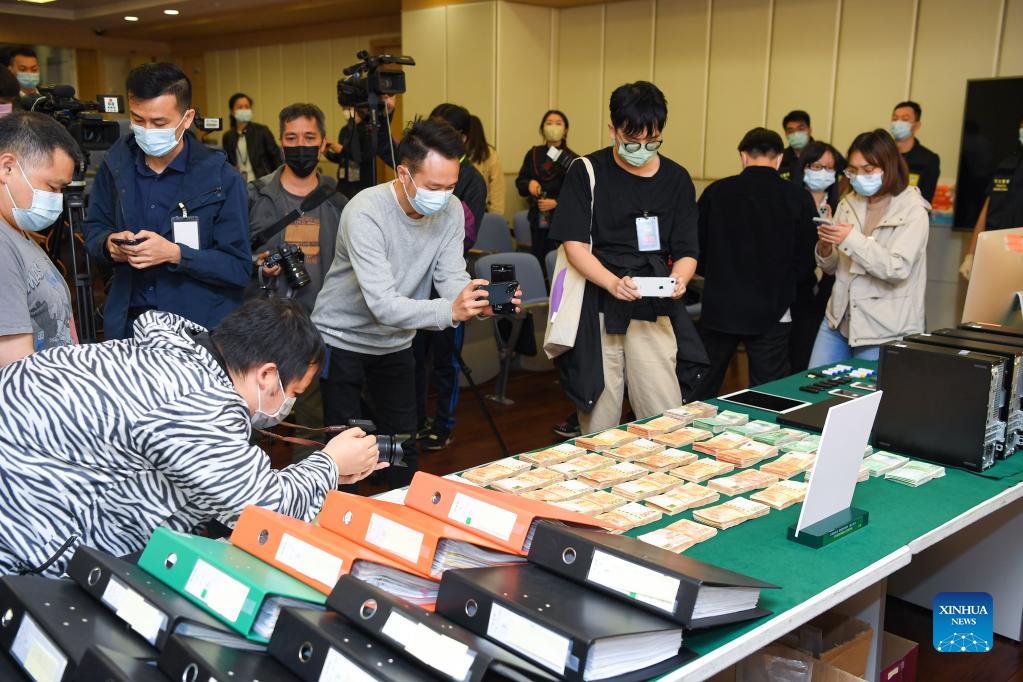 Reporters take photos of the evidence at a press conference held by the Judiciary Police under China's Macao Special Administrative Region (SAR) government in Macao, south China, Nov. 28, 2021. Police in China's Macao SAR on Sunday detained 11 people suspected of being involved in illegally running gambling businesses or money laundering, and referred the case to procurators. (Xinhua/Cheong Kam Ka)