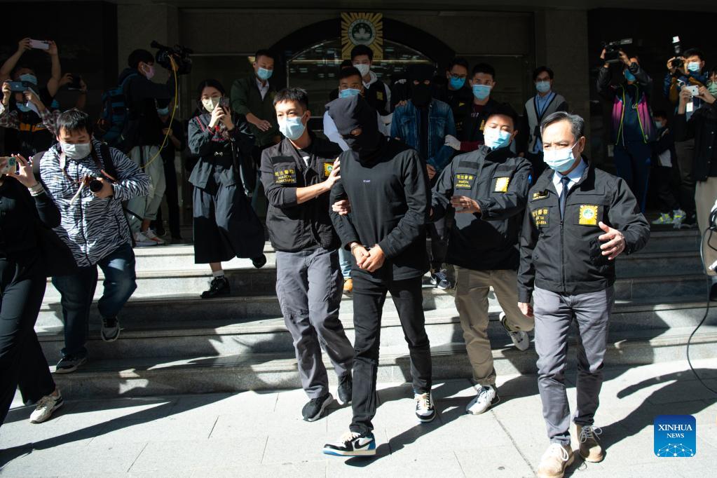 Police in China's Macao Special Administrative Region (SAR) escort a suspect of gambling crimes in Macao, south China, Nov. 28, 2021. Police in China's Macao SAR on Sunday detained 11 people suspected of being involved in illegally running gambling businesses or money laundering, and referred the case to procurators. (Xinhua/Cheong Kam Ka)