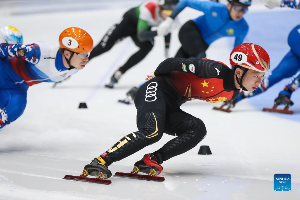 An Kai (R) of China competes during the Semifinal of men's 5000m relay race at the ISU World Cup Short Track Speed Skating series in Dordrecht, the Netherlands, Nov. 27, 2021. (Xinhua/Zheng Huansong)