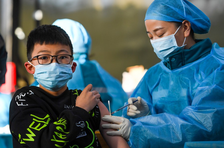 A kid receives a dose of COVID-19 vaccine at a school in Hohhot, north China's Inner Mongolia Autonomous Region, Nov. 23, 2021. Hohhot recently launched a COVID-19 vaccination campaign for children aged 3 to 11. (Xinhua/Peng Yuan)