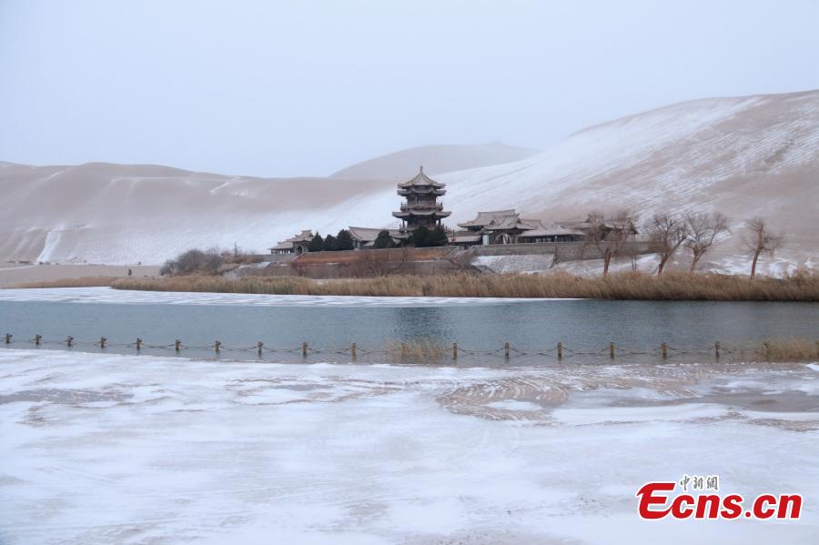 Photo taken on Nov. 28, 2021 shows the snow scenery of Mingsha Mountain and Crescent Spring scenic spot in Dunhuang City, Northwest China's Gansu Province. (Photo: China News Service/Zhang Xiaoliang)