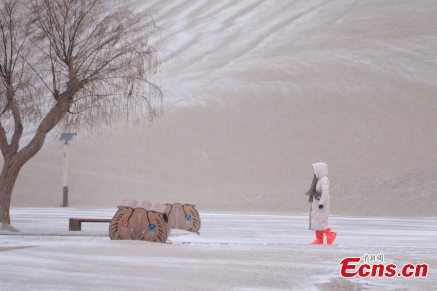 Photo taken on Nov. 28, 2021 shows the snow scenery of Mingsha Mountain and Crescent Spring scenic spot in Dunhuang City, Northwest China's Gansu Province. (Photo: China News Service/Zhang Xiaoliang)