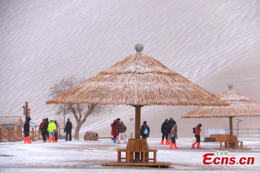 Photo taken on Nov. 28, 2021 shows the snow scenery of Mingsha Mountain and Crescent Spring scenic spot in Dunhuang City, Northwest China's Gansu Province. (Photo: China News Service/Zhang Xiaoliang)