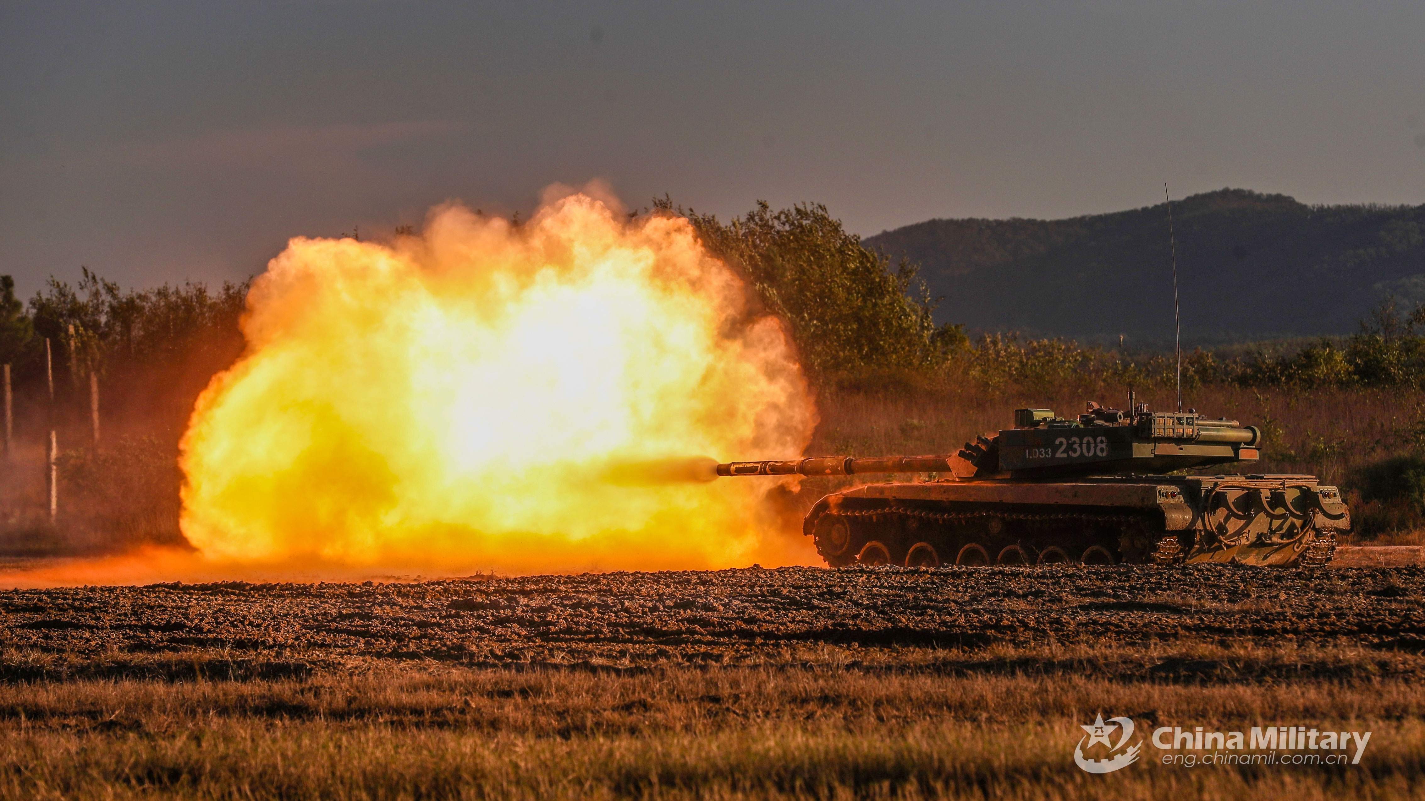 A main battle tank (MBT) attached to a combined arms brigade under the PLA 72nd Group Army spits fire down range at mock ground target during a live-fire training exercise on November 8, 2021. (eng.chinamil.com.cn/Photo by Zhang Wenju)