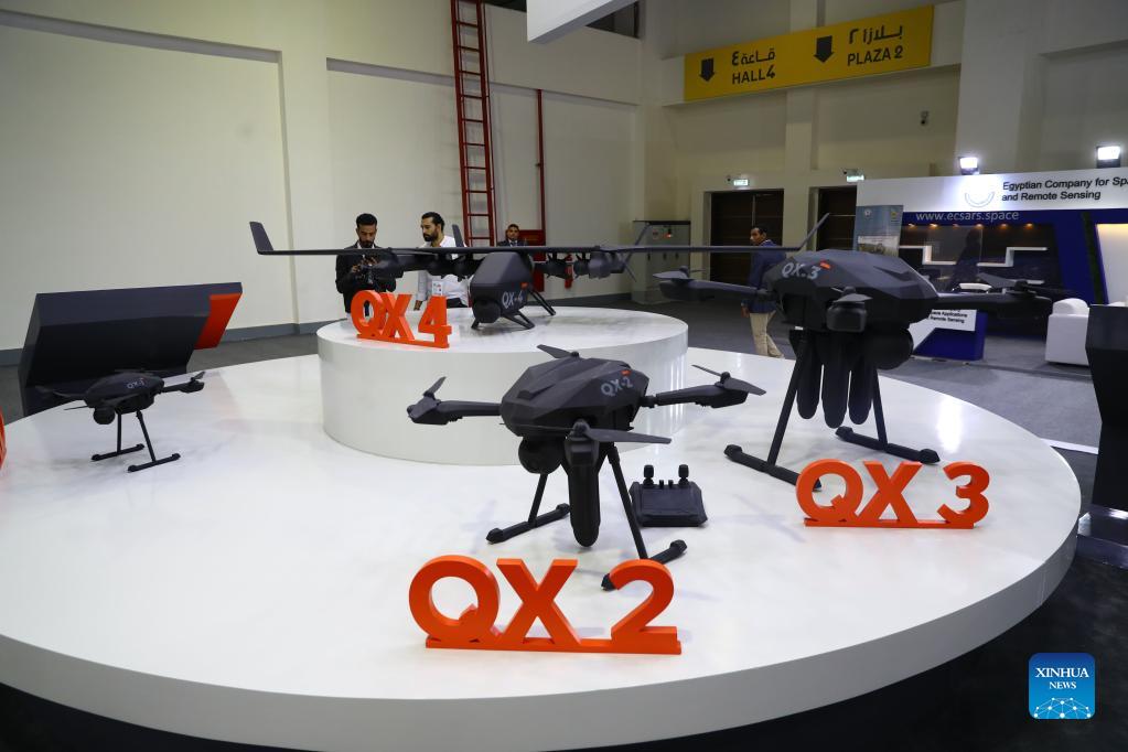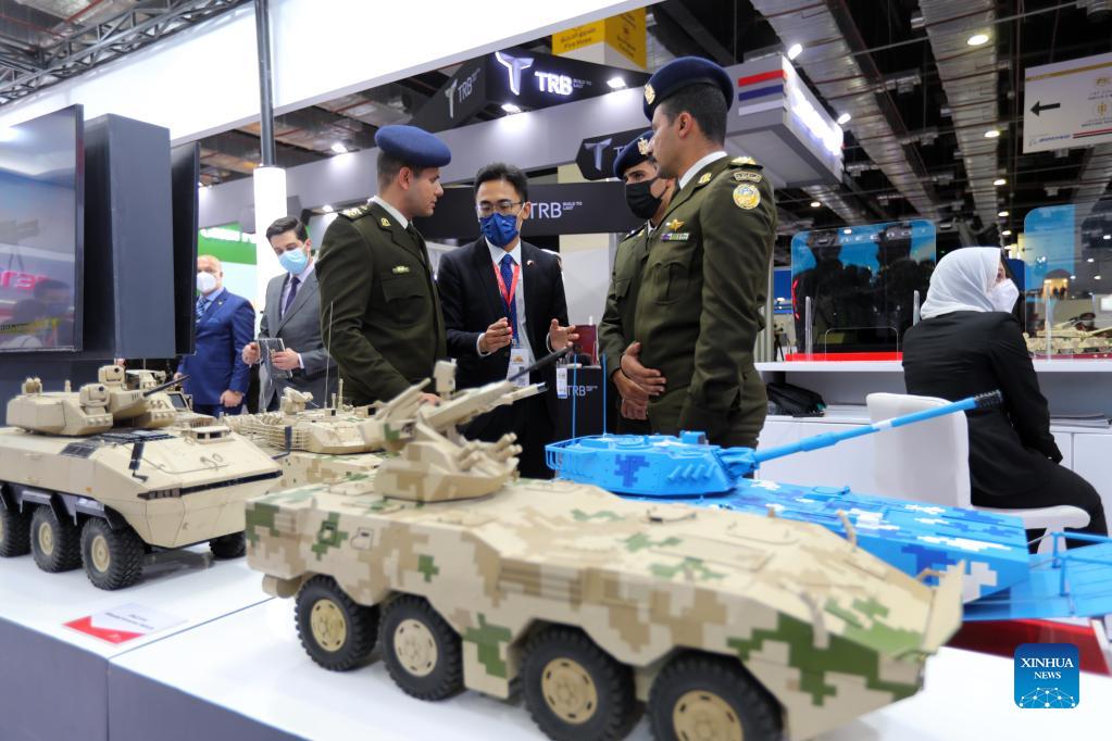 People visit the booth of China National Aero-Technology Import &Export Corporation during an international defense expo in Cairo, Egypt, on Nov. 29, 2021. Egypt held on Monday the second edition of its largest international defense expo, EDEX 2021, with more than 400 defense companies from 42 countries, including China, showcasing their up-to-date defense products. (Xinhua/Sui Xiankai)