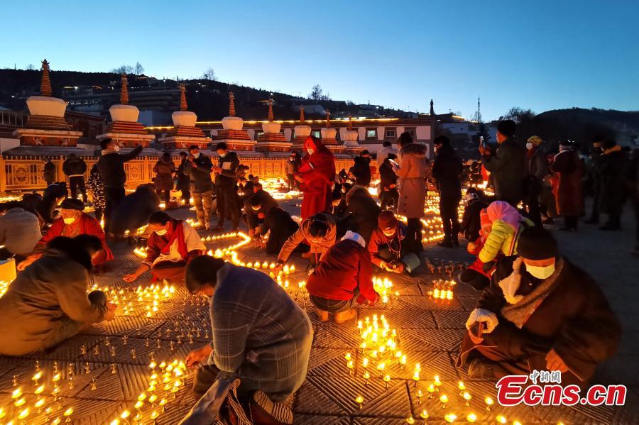 Photo taken on Nov. 29, 2021 shows the Butter Lamp Festival at Taer Monastery in northwest China's Qinghai Province. People pray for happiness and good health by lighting butter lamps at the festival. (Photo: China News Service/Zhang Tianfu)