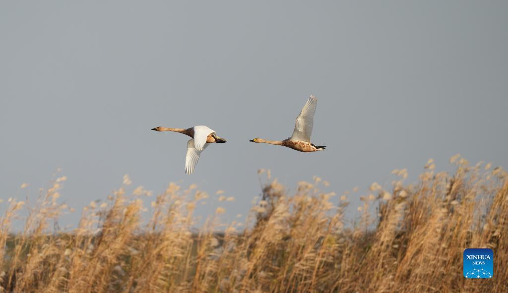 Two swans fly over the Wuxing white crane conservation area by the Poyang Lake in Nanchang, east China's Jiangxi Province, Nov. 30, 2021. Numerous migratory birds including white cranes and swans have arrived in the wetland by the Poyang Lake, taking it as their winter habitat. (Xinhua/Zhou Mi)
