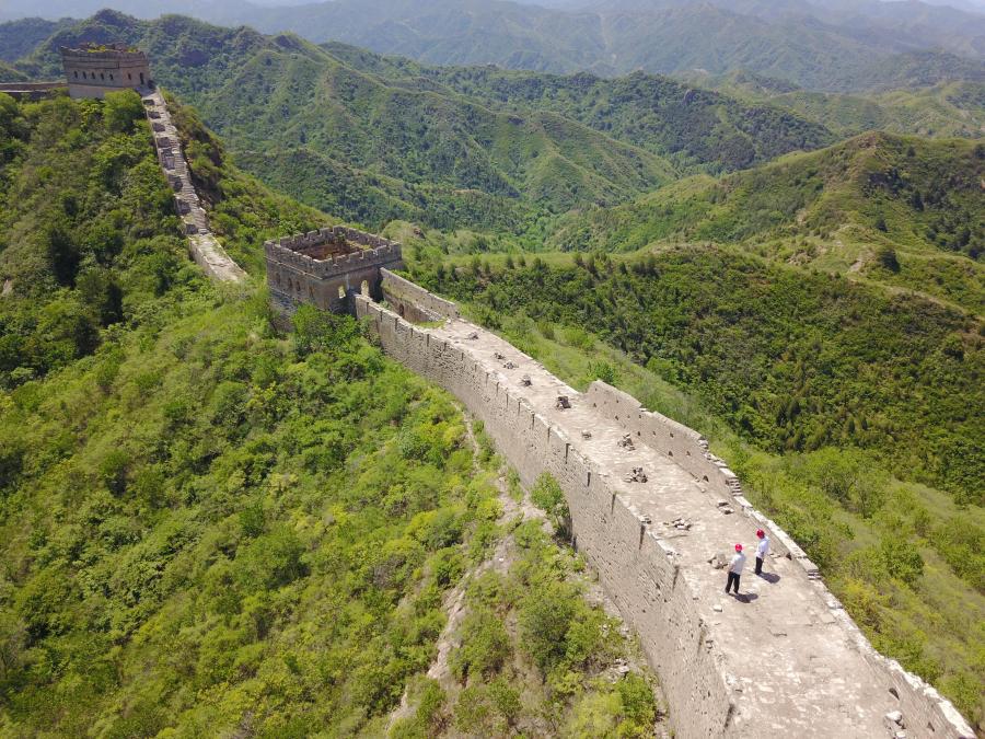 Aerial photo taken on June 11, 2021, shows technicians checking the condition of the Jinshanling Great Wall in Luanping County, north China's Hebei Province. (Xinhua/Wang Liqun)